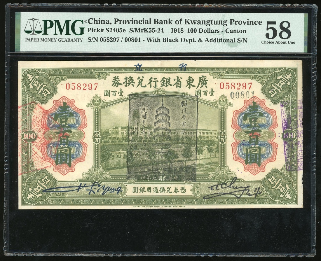 The Provincial Bank of Kwangtung Province, $100, 1.1918, serial number 058297 with additional serial 00801 overprinted when reissued, (Pick S2405e), PMG 58 Choice About Uncirculated.