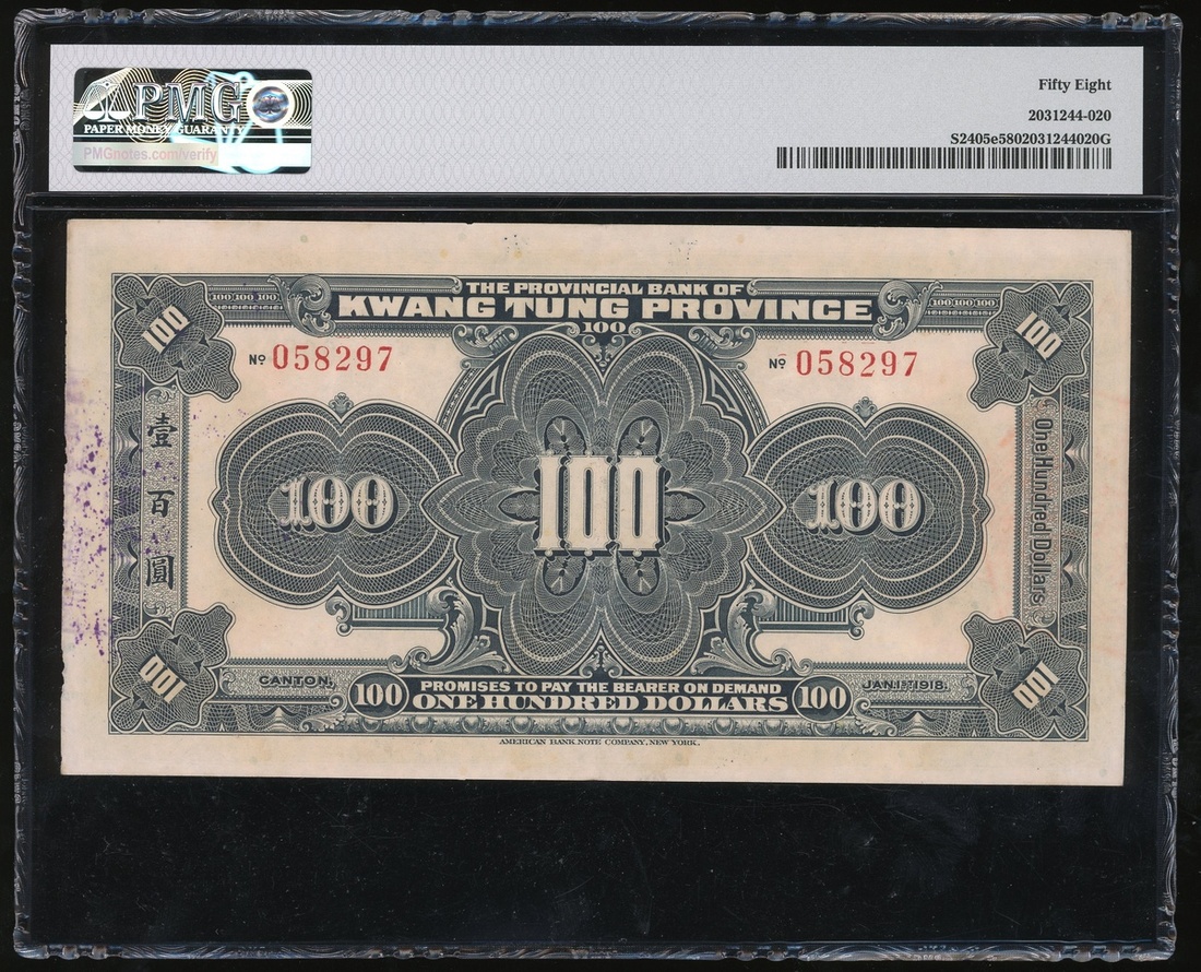 民國七年(1918)廣東省銀行兌換券100元,編號058297,另外再次流通時加蓋黑色編號00801,PMG 58