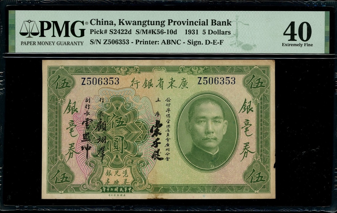 Kwangtung Provincial Bank, $5, local currency, Year 20 (1931), serial number Z506353, (Pick S2422d), PMG 40 Extremely Fine