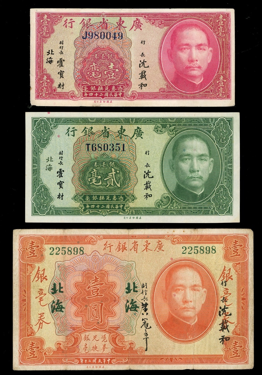 民國二十年(1931)廣東省銀行1毫,2毫及1元,第三枚為北海地名,編號J980049,T680351及225898,首枚GVF有漬及紙邊有損,第二枚UNC有微黃,第三枚GF