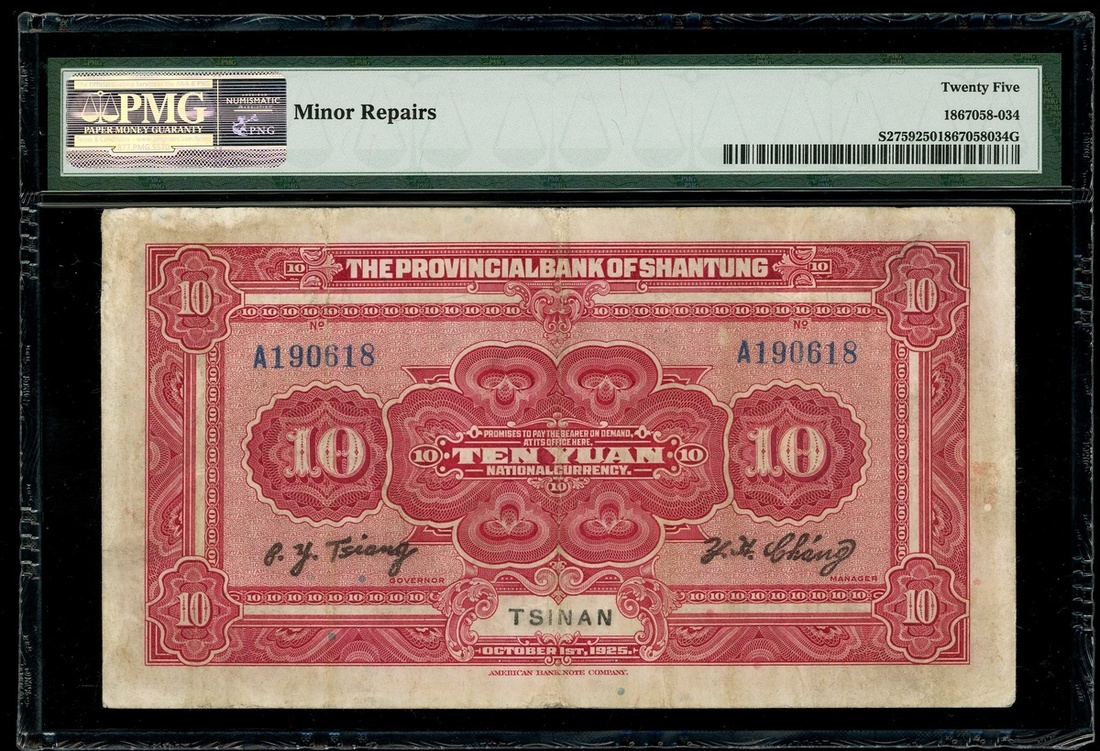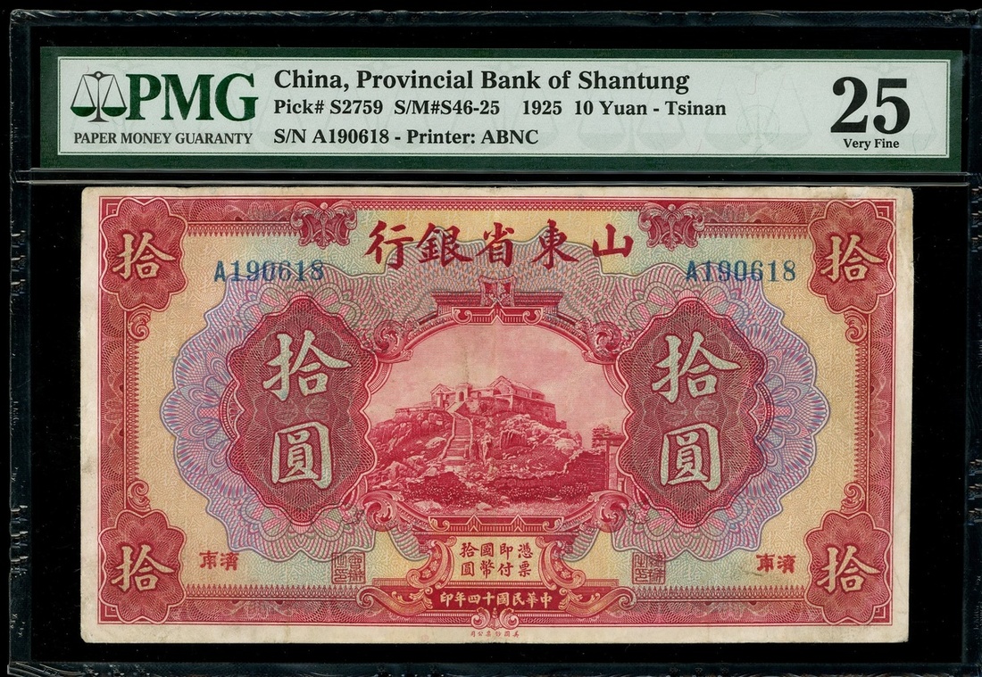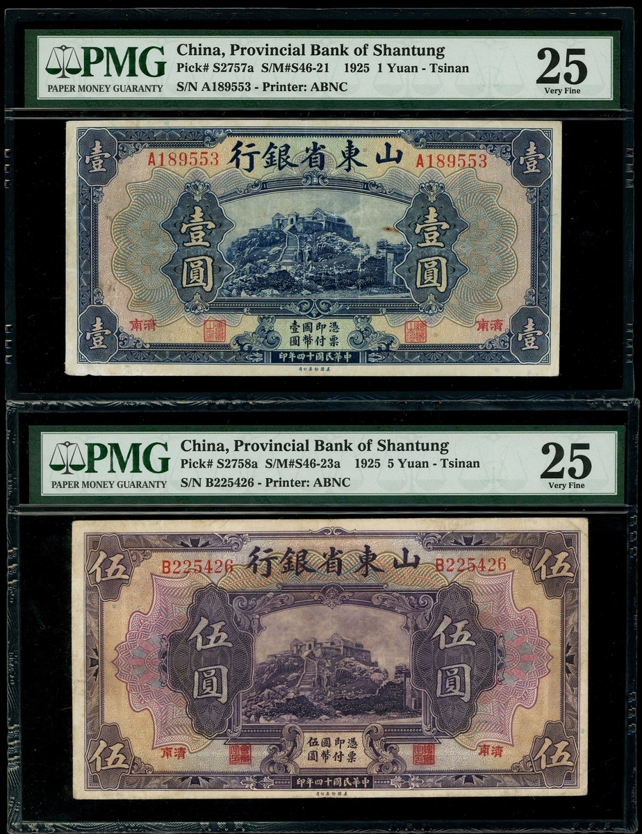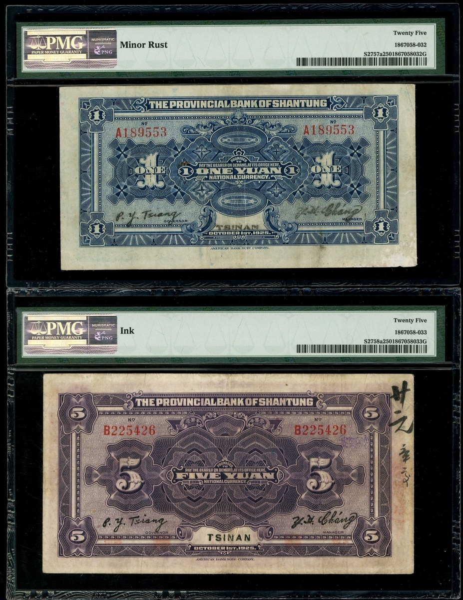 Provincial Bank of Shantung, a set of 1, 5 and 10 yuan, 1925, Tsinan, serial number A189553, B225426, A190618, (Pick S2757a, S2758a, S2759), all PMG 25, very fine.(3)