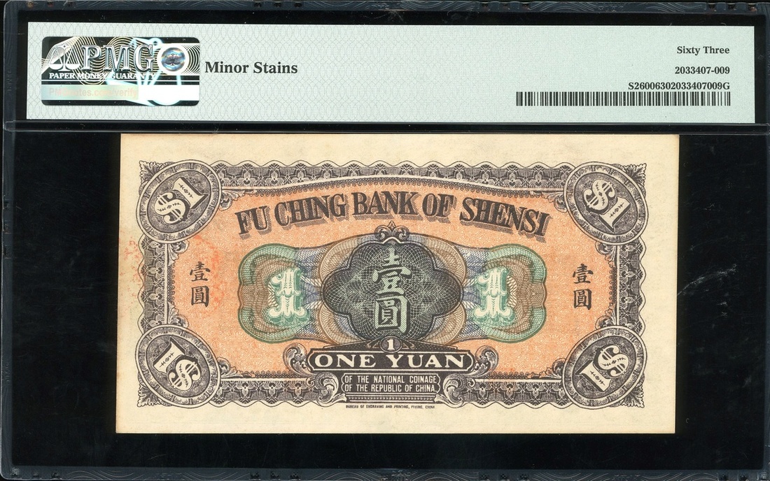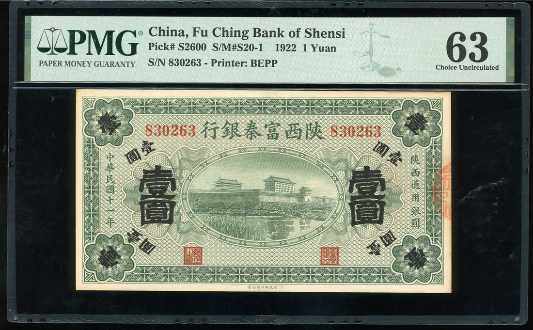 Fu Ching Bank of Shensi, 1 Yuan, 1922, serial number 830263, (Pick S2600), PMG 63 Choice Uncirculated (Minor Stains).