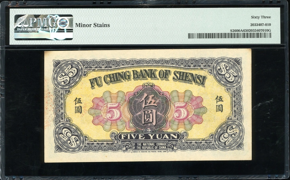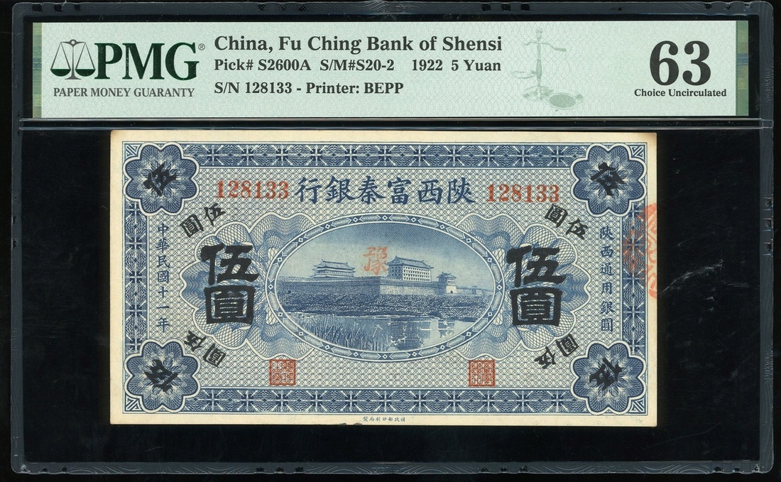 Fu Ching Bank of Shensi, 5 Yuan, 1922, serial number 128133, (Pick S2600A), PMG 63 Choice Uncirculated (Minor Stains).