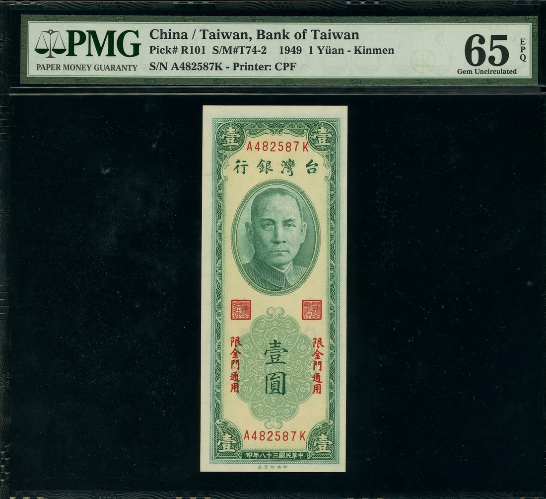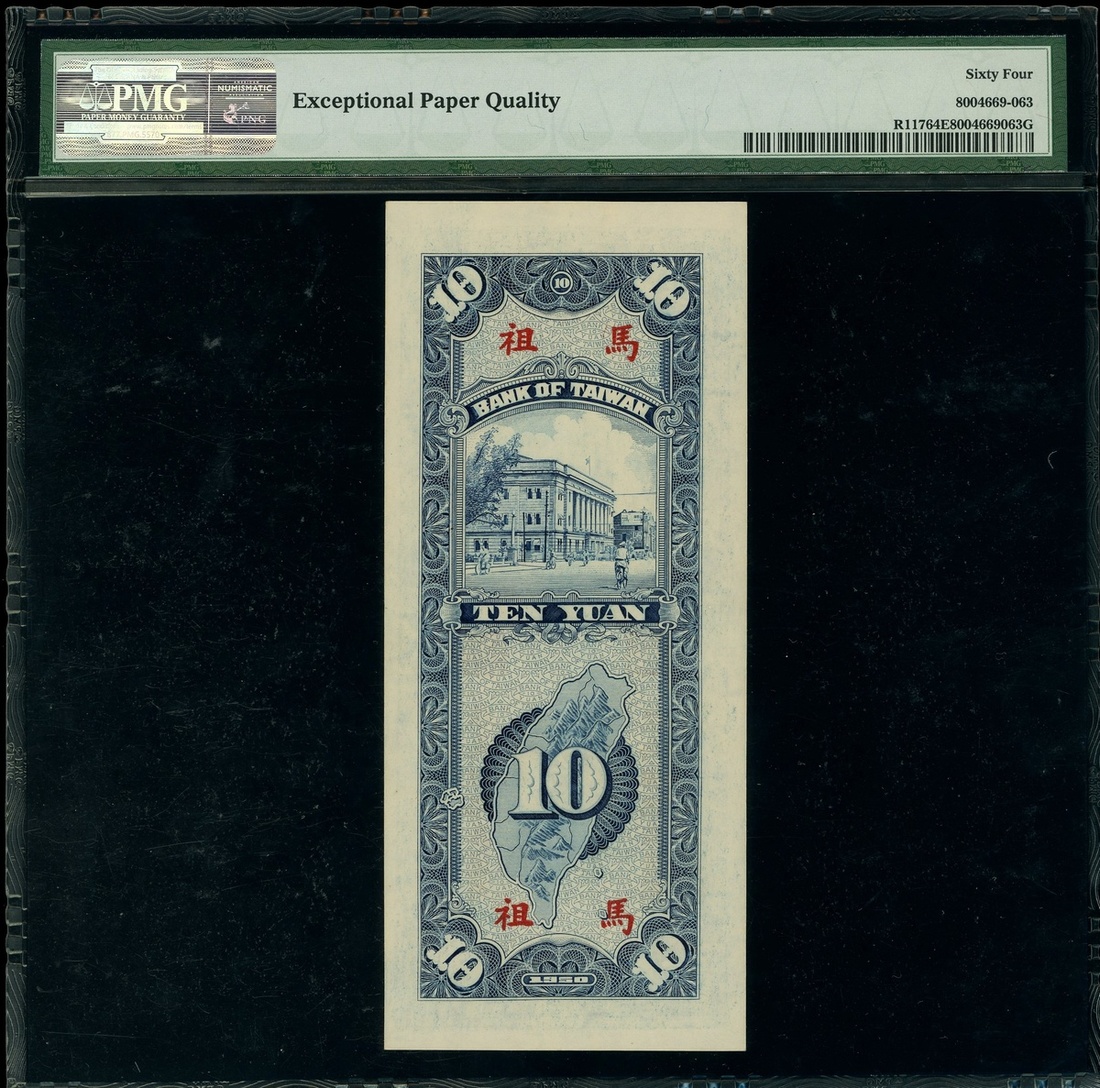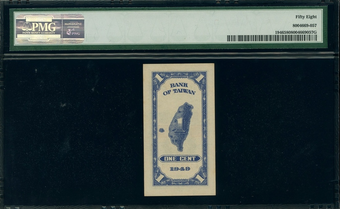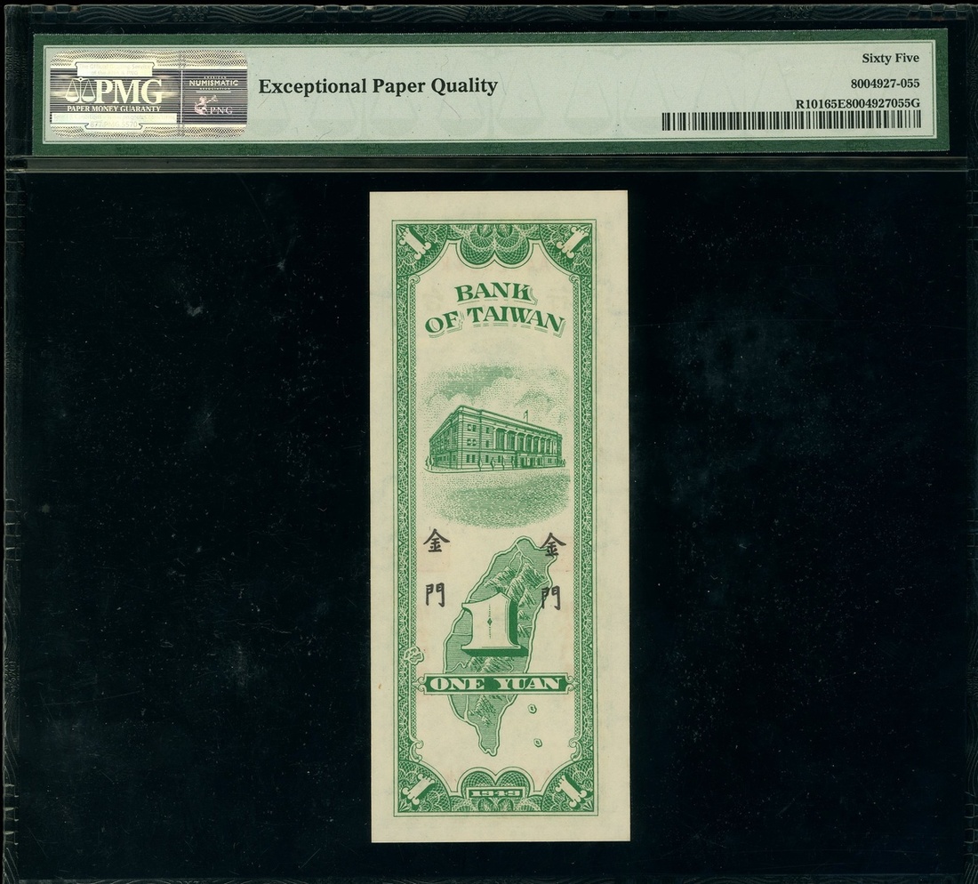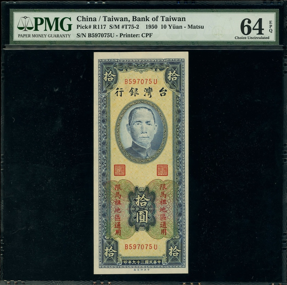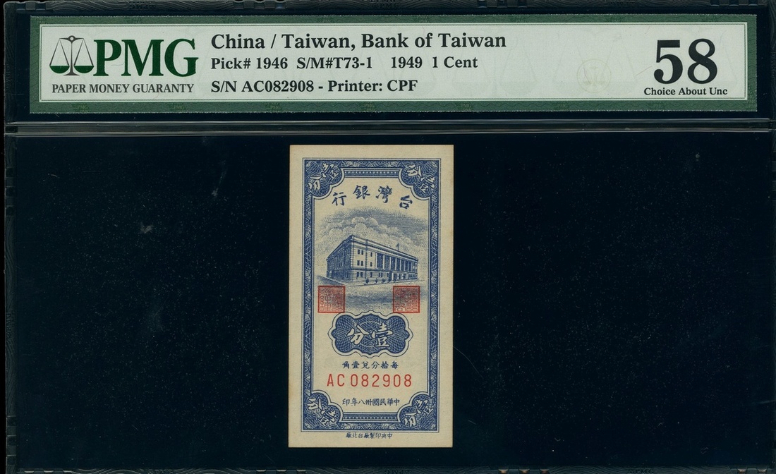 臺灣銀行一組3枚,包括1949年1分,1949年1元,金門地名,以及1950年10元,媽祖地名,編號 AC 0892908,A482587K及B597075U,分別評PMG 58,65EPQ及64EPQ