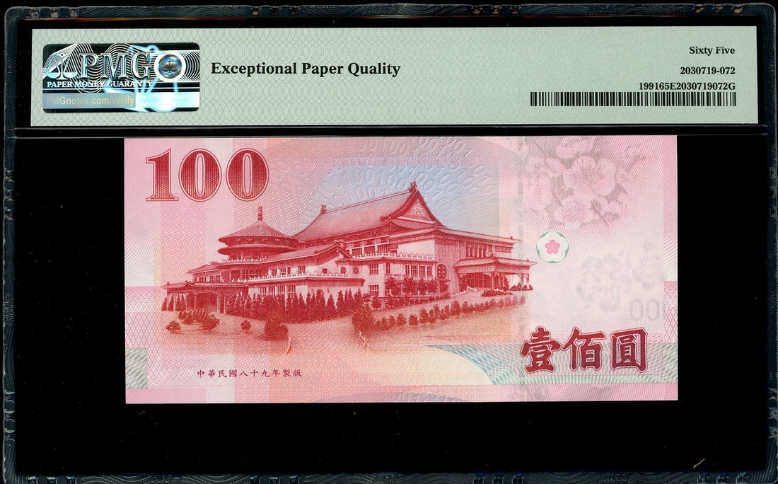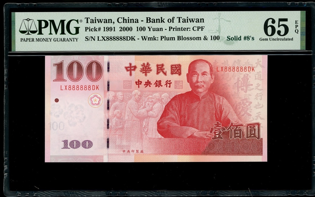 Bank of Taiwan, 100 Yuan, 2000, solid serial number LX888888DK, (Pick 1991), PMG 65EPQ Gem Uncirculated.
