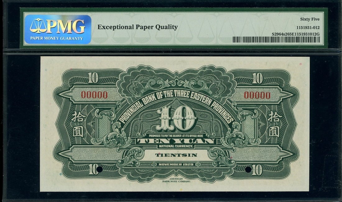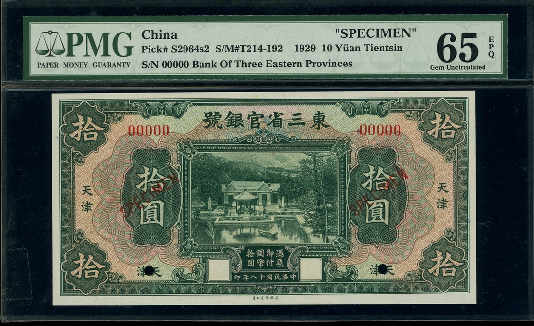 Provincial Bank of the Three Eastern Province, 10 yuan, specimen, Tietsin, 1929, serial number 00000, (Pick S2964s2), PMG 65EPQ Gem Uncirculated