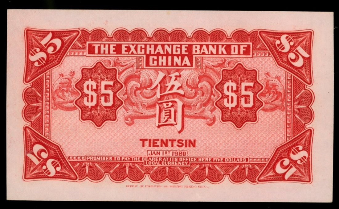 The Exchange Bank of China, $5, Tientsin, remainder, 1.1.1920, serial numbr 263171, signatures absent,