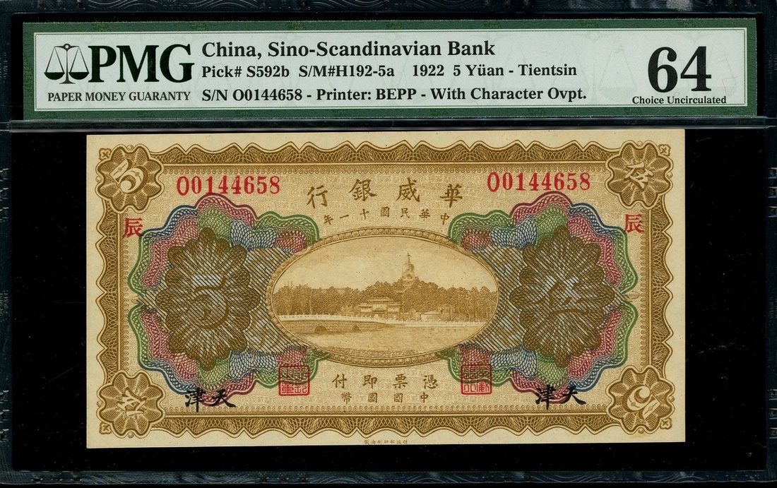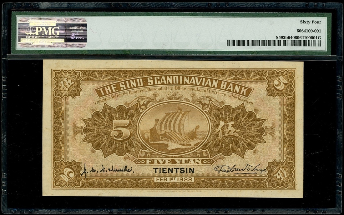 Sino Scandinavian Bank, 5 yuan, Tientsin, 1922, serial number O 0144658, (Pick S592b), PMG 64 Choice Uncirculated