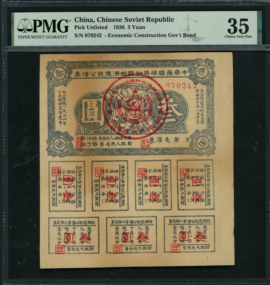 Chinese Soviet Republic, Economic and Construction Government Bond, 3 Yuan, 1936, number 070242, (Pick unlisted), PMG 35 Choice Very Fine (Stained). With 7 coupons attached at the bottom.