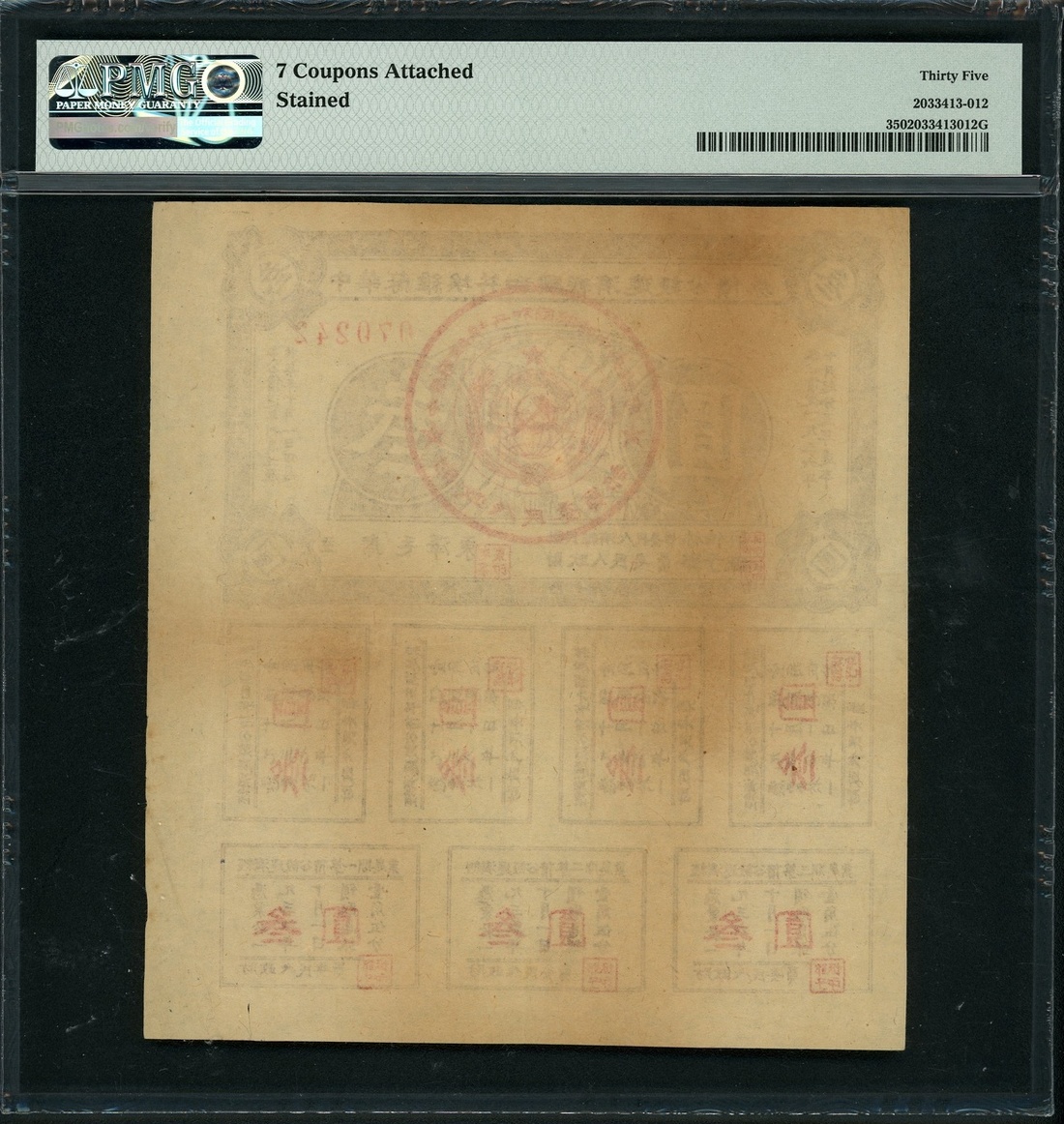 1936年中華蘇維埃共和國經濟建設公債券3元,編號070242,PMG 35,有漬,附有7枚息票