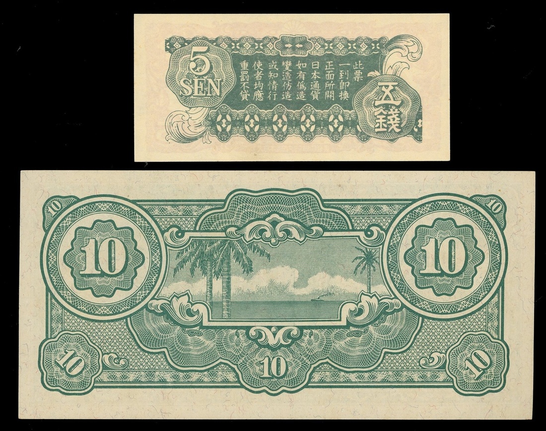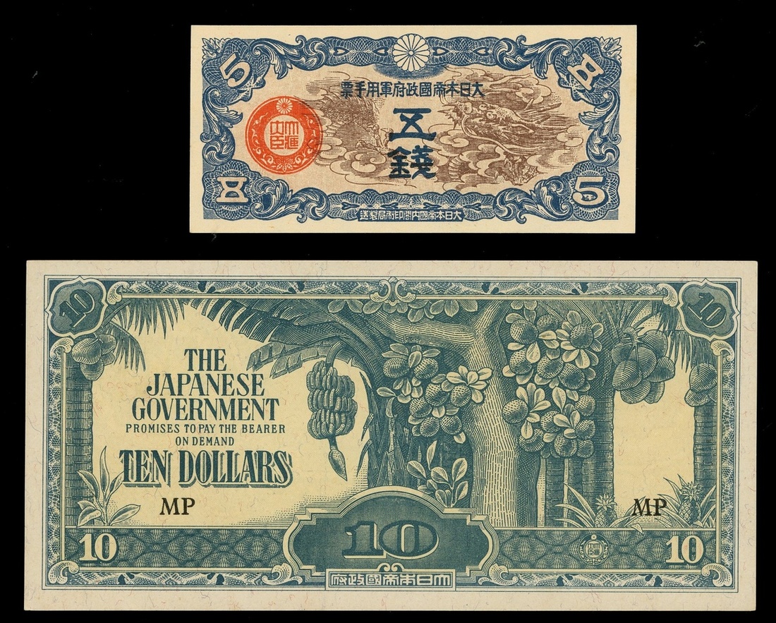 日本軍票一對,包括1940年5錢,於中國發行,及1942-1944年10元,於馬來亞發行,均無日期,皆UNC品相,前者紙邊有微黃,後者有軟折