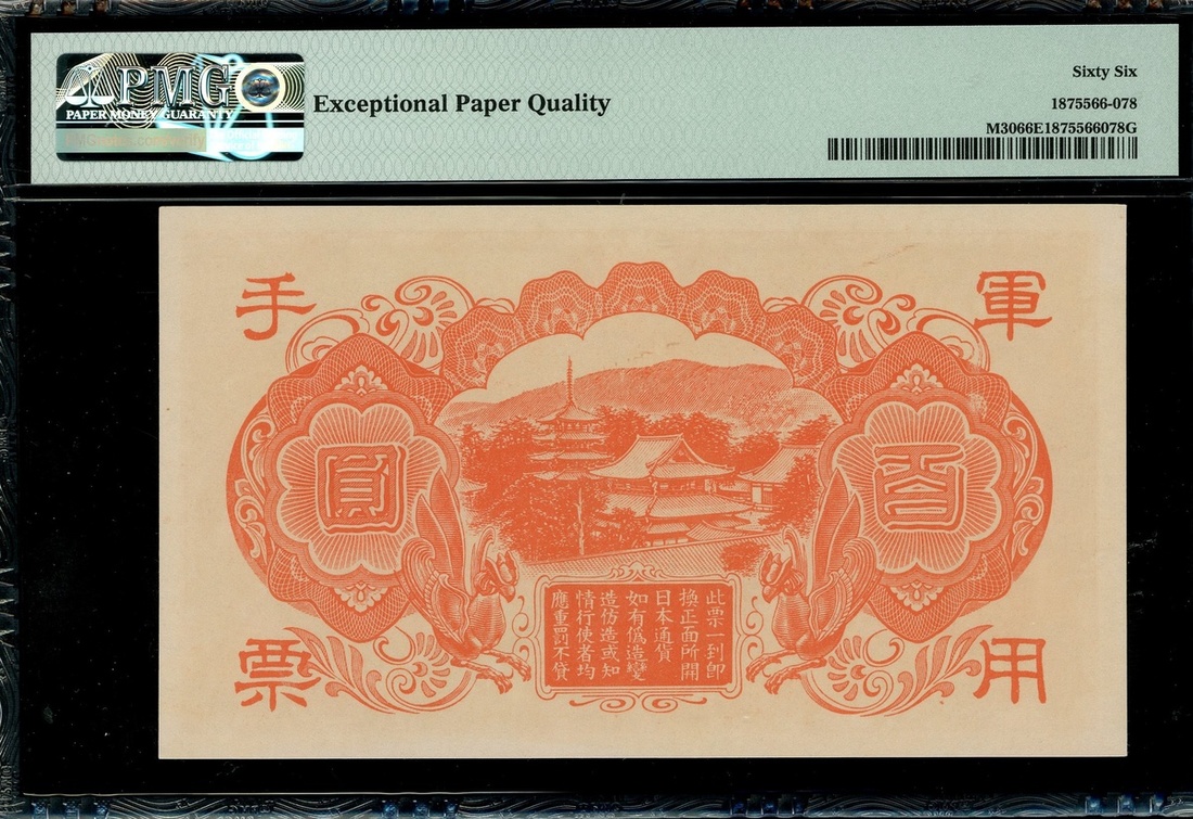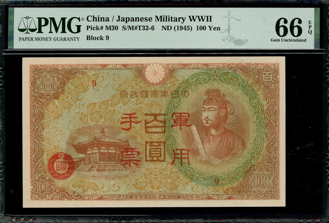 Japanese Military, 100 yen, no date (1945), block 9, (Pick M30), PMG 66EPQ Gem Uncirculated.