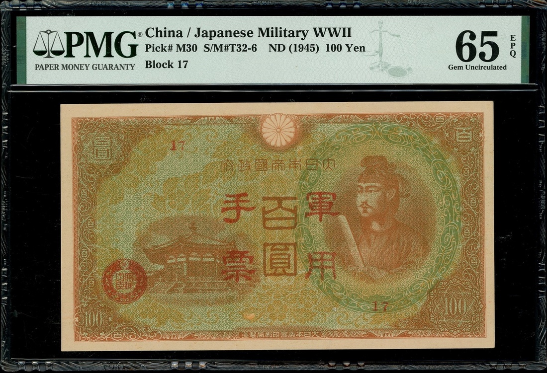 1945年日本軍用手票100元,組號17,輕微印刷受阻錯體,PMG 65EPQ