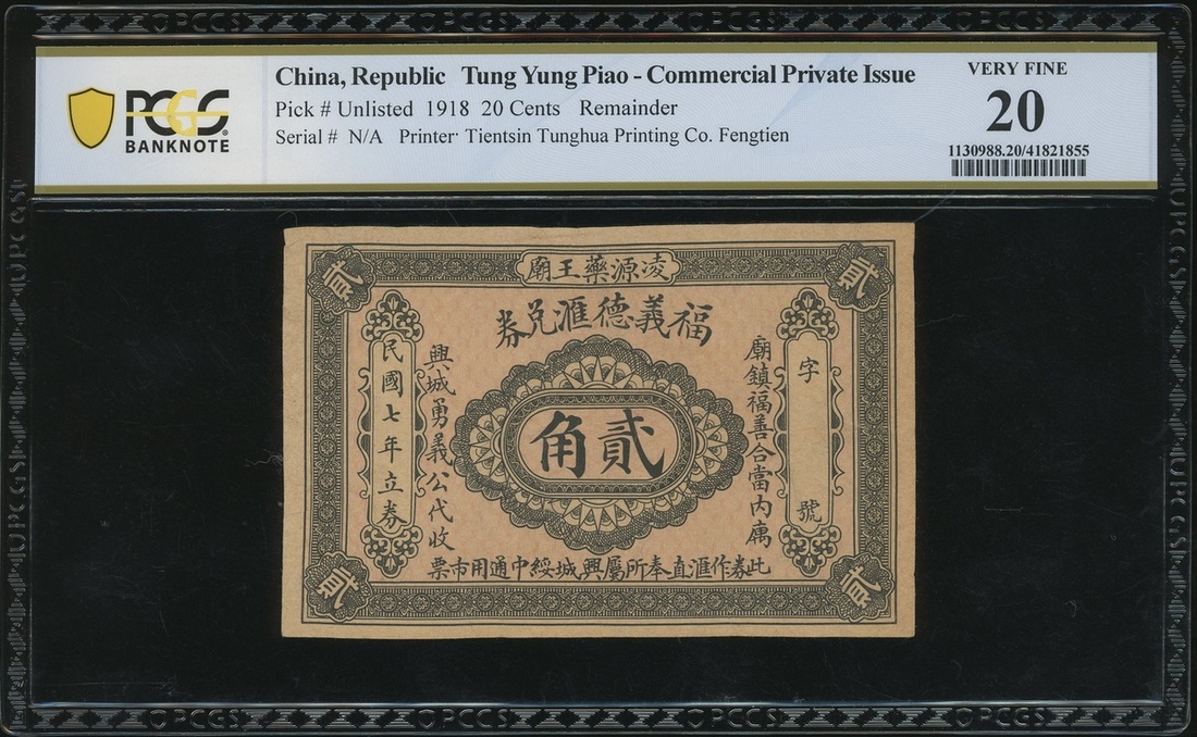 Private Issue, Tung Yung Piao, 20 cents, 1918, remainder, printer: Tientsin Tunghua Printing Co., Fengtien,