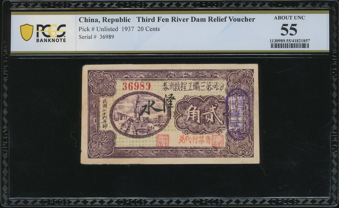 Private Issue, Third Fen River Dam Relief Voucher, 20 cents, 1937, serial number 36989, (Pick unlisted), PCGS Banknote 55 about uncirculated.