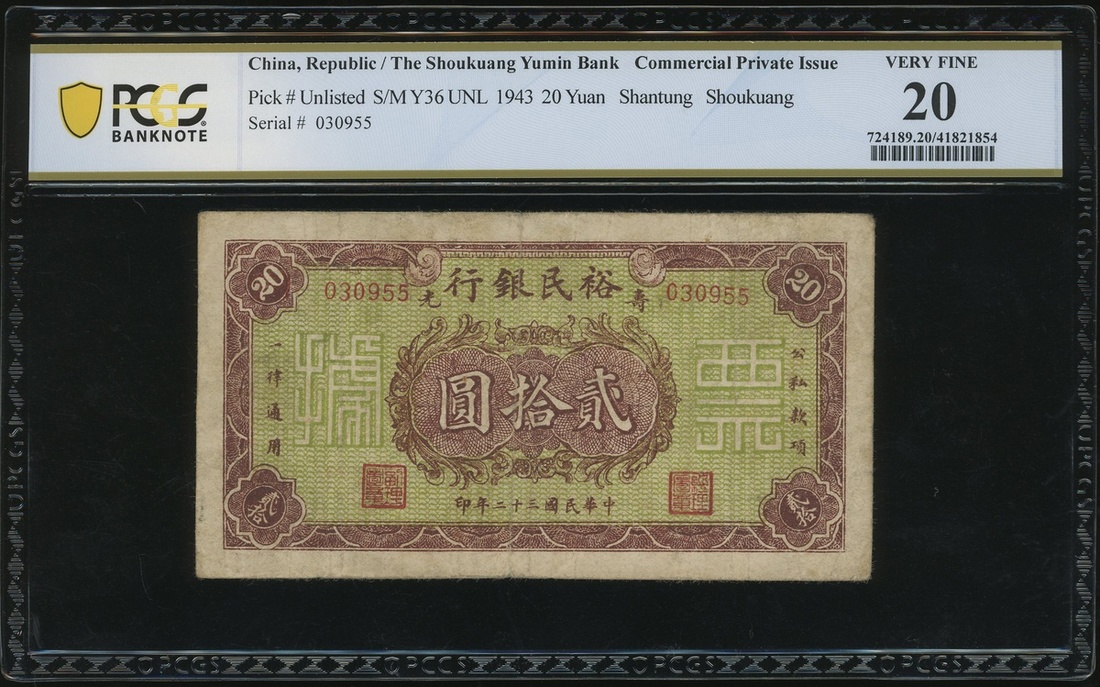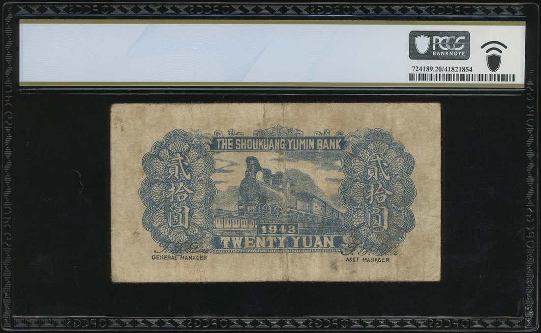 Shoukuang Yumin Bank, 20 yuan, 1943, serial number 030955, (Pick unlisted), PCGS Banknote 20 very fine.