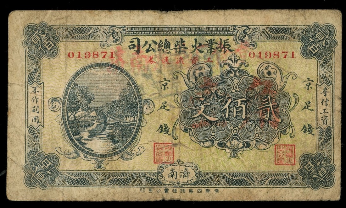 Private Issue, 200 cash, Zhenye Match Company wages coupon, Jinan, serial number 019871, (Pick unlisted), good fine.
