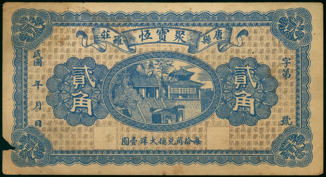 唐縣聚寳恆2角,庫存票,GEF,左下紙邊有缺