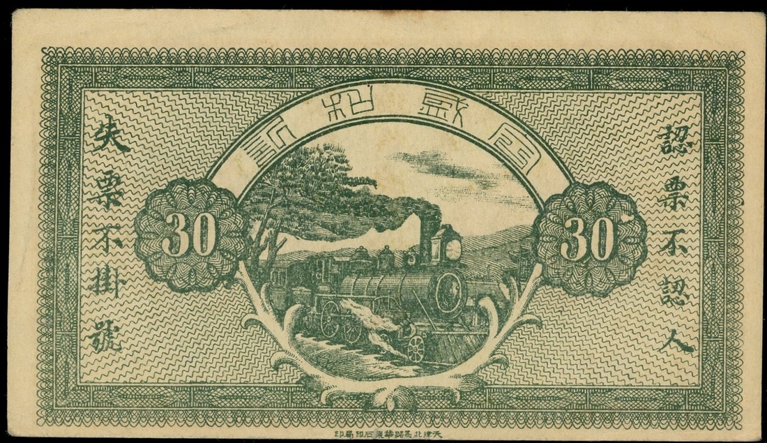 Private Issue, 30 coppers, Republican era, remainder, red ornate border, yellow-green underprint, reverse green, steam train at centre,