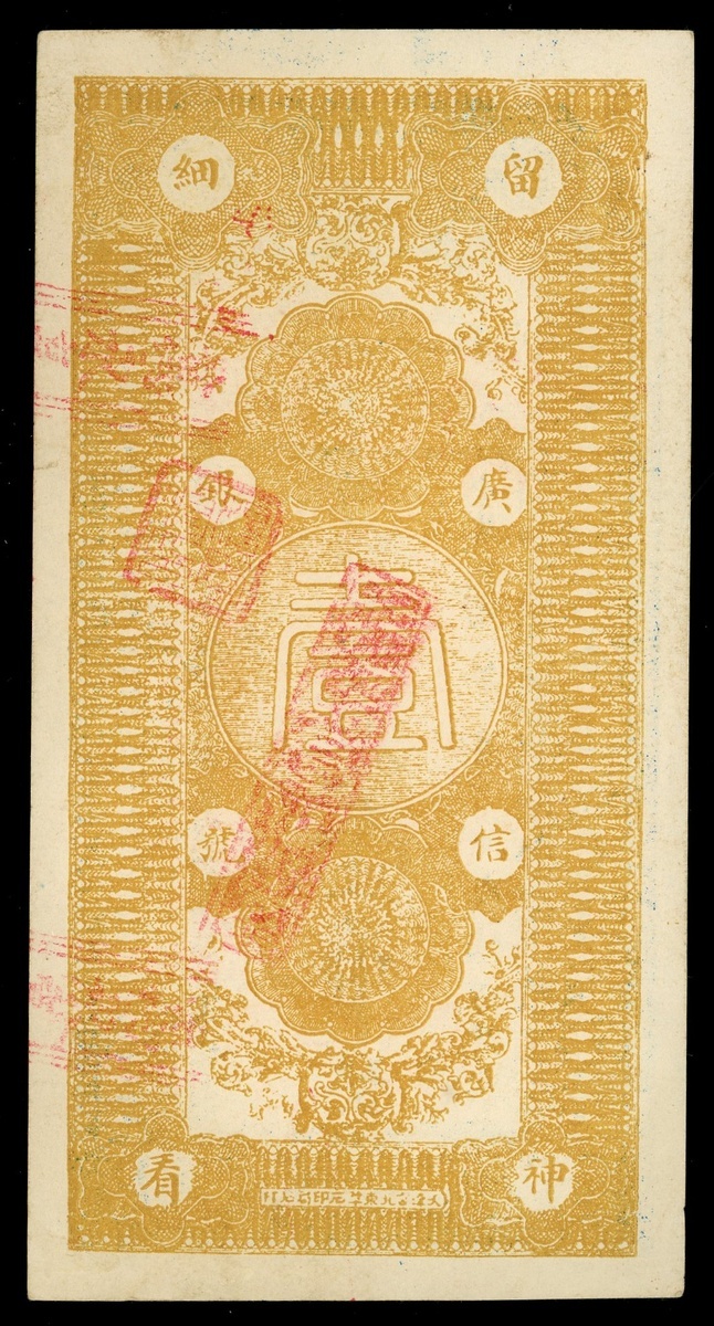 Private Bank, Kwang Sing Bank, 1 tiao, Republican era, remainder, blue, vertical format, multiple red stamps on obverse and reverse,