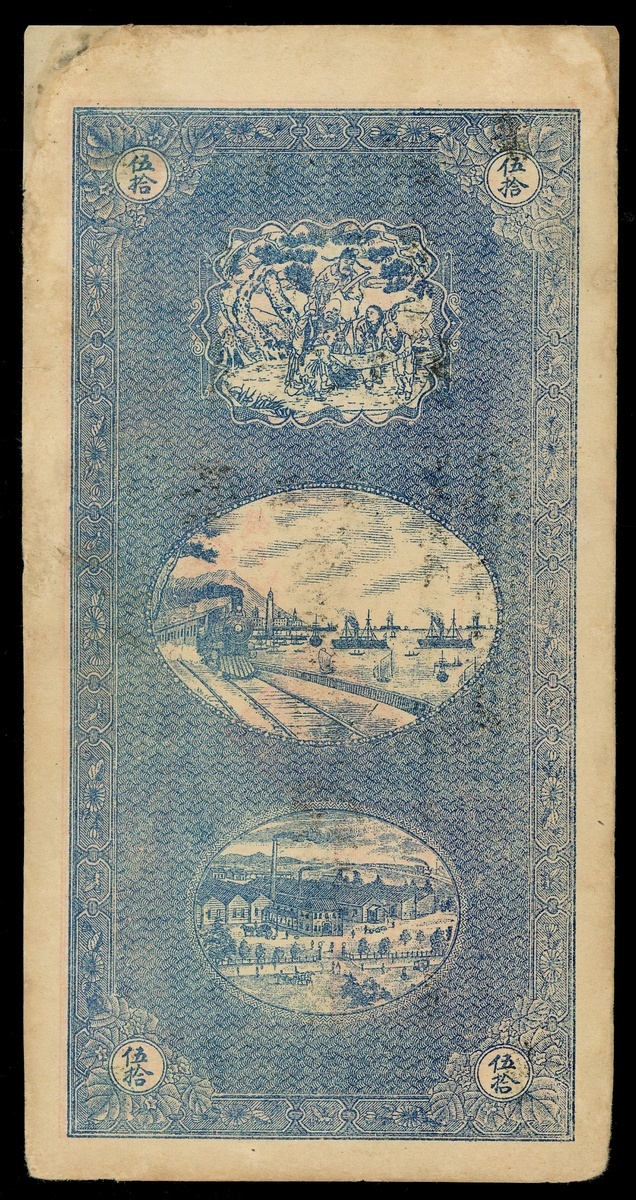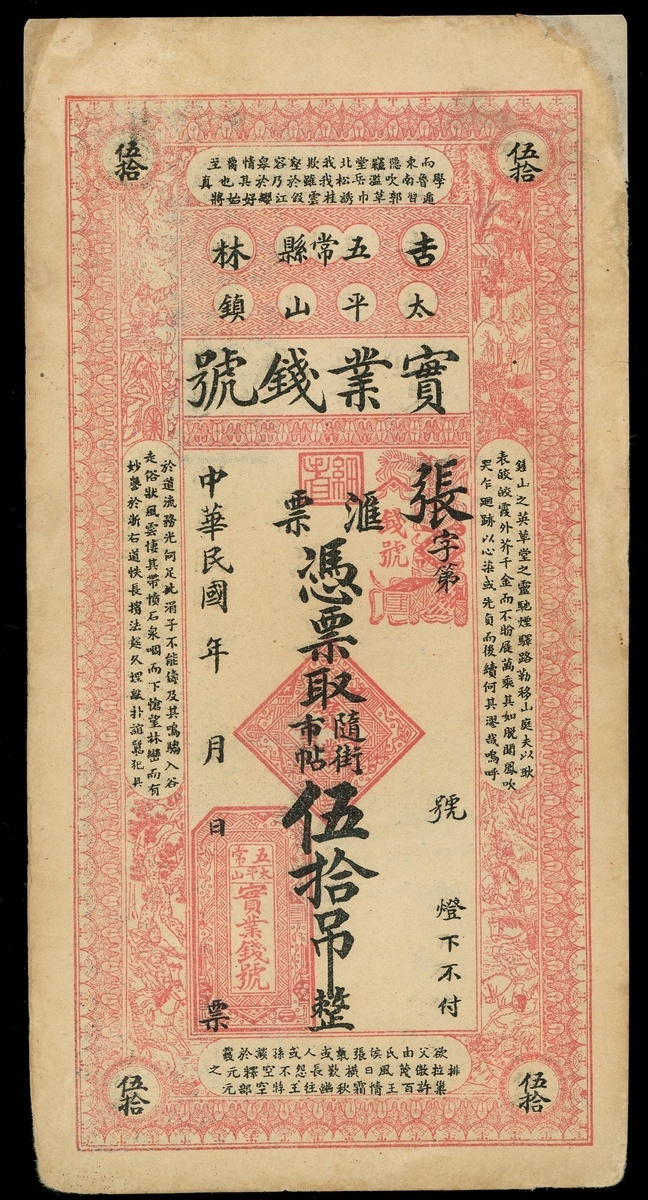 Republican Period, Private Issue, Kirin Shi Ye Bank, unused 50 tiao, black and red, vertical format,