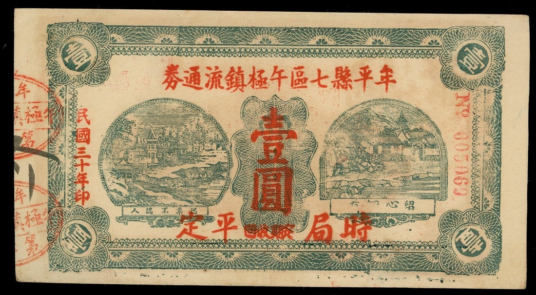 民國三十年(1941)牟平縣七區午極鎮流通券1元,編號005069,微黃,UNC