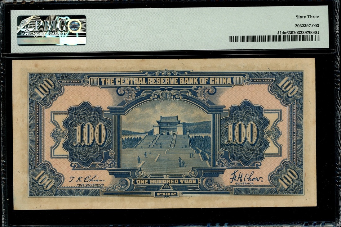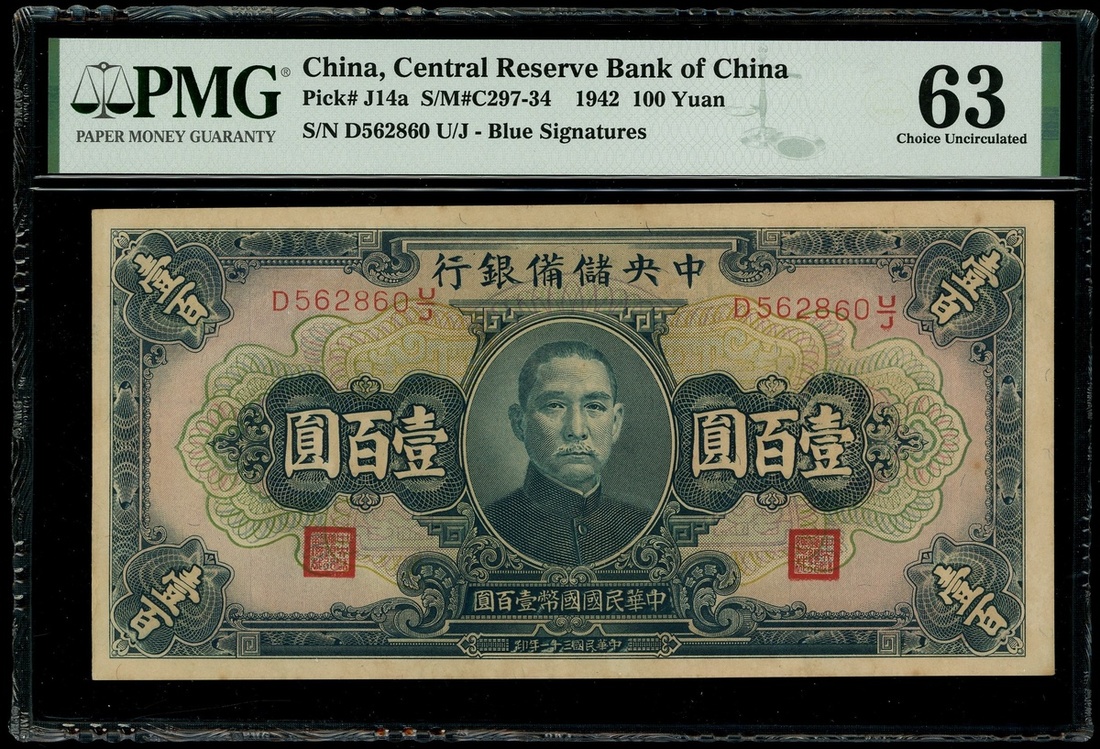 Central Reserve Bank of China, 100 yuan, 1942, serial number D562860U/J, (Pick J14a), PMG 63, choice uncirculated.