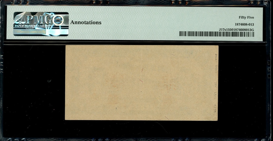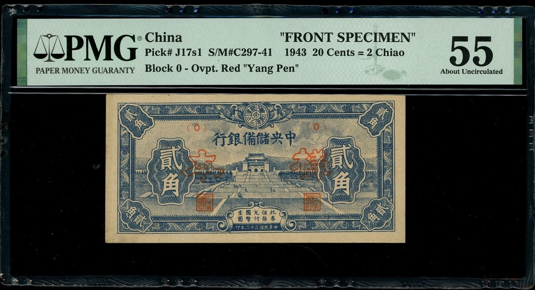 1943年中央儲備銀行2角正面樣票,PMG 55,背面有書寫,罕見