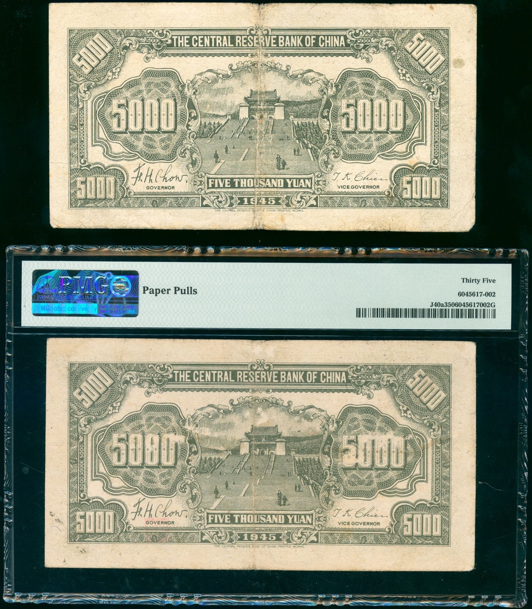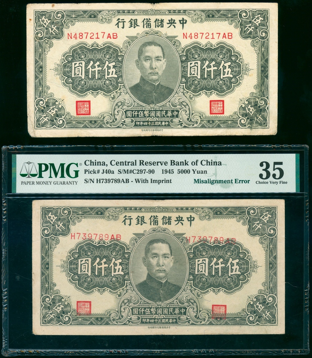The Central Reserve Bank of China, a pair of 5000 yuan, 1945, ERROR NOTE, serial number H739789AB, serial number misalignment error, and a regular note, serial number N487217AB, (Pick J40a), the error note graded PMG 35 (Paper Pulls) and the other good very fine (2).