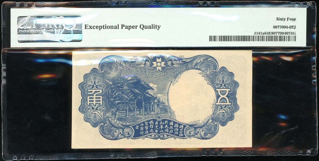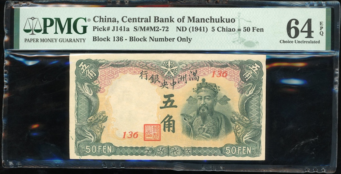 Central Bank of Manchukuo, 5 chiao, ND (1941), block serial 136, (Pick J141a), PMG 64EPQ Choice Uncirculated. Encased in a hardened PMG holder. Sold as is no returns.