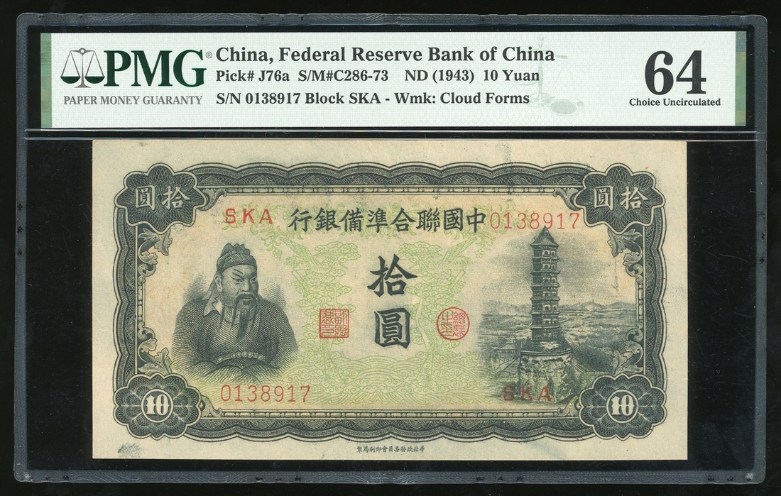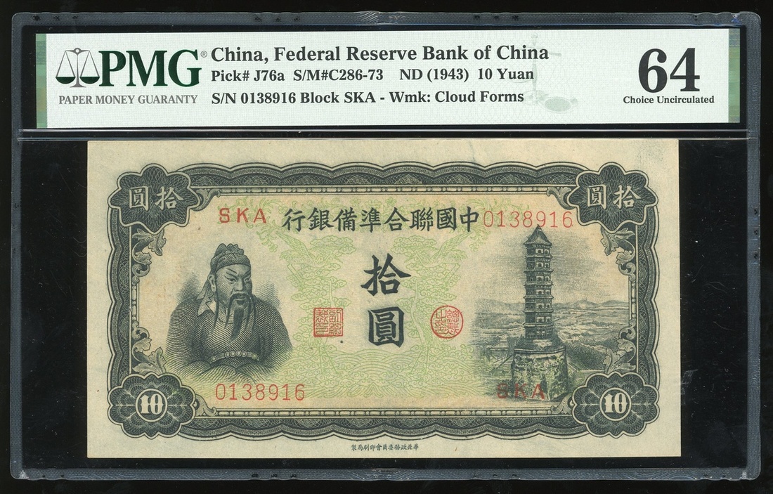The Federal Reserve Bank of China, a pair of 10 Yuan, ND (1943), serial number SKA 0138916-917, (Pick J76a), both graded PMG 64 Choice Uncirculated (2)