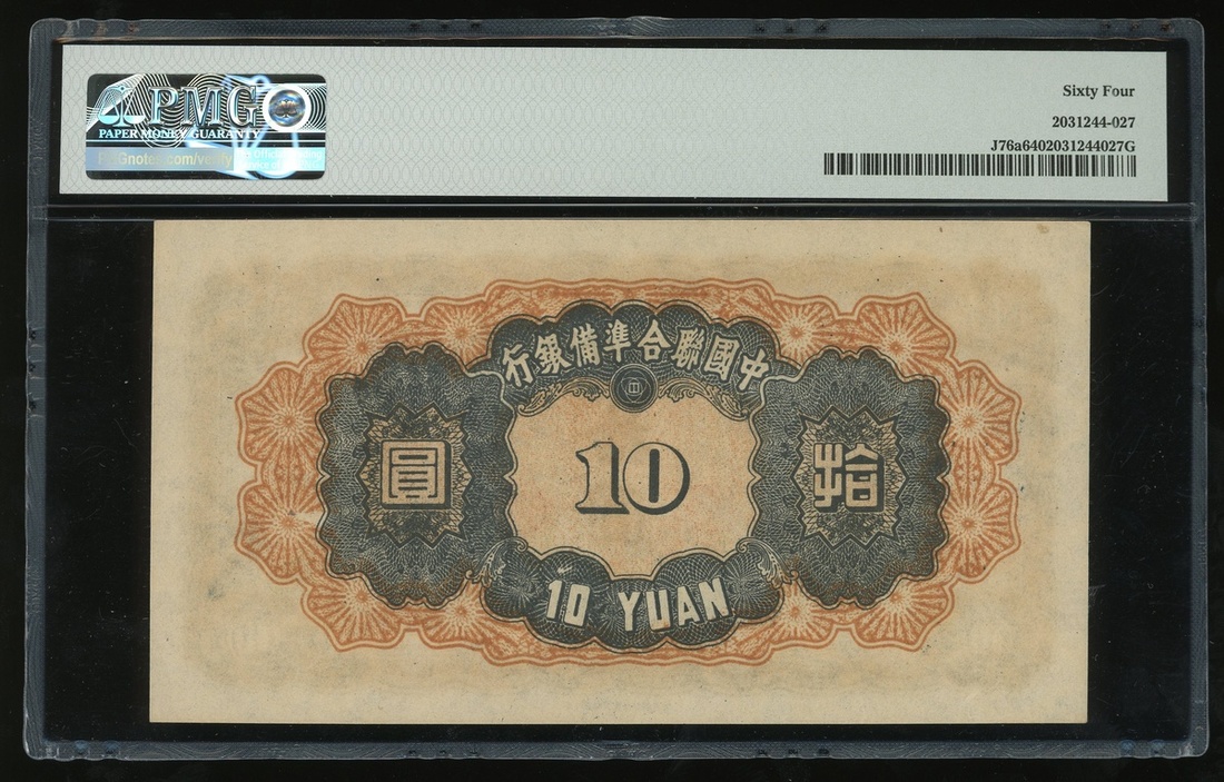 1943年中國聯合準備銀行10元2枚,無日期,連號SKA 0138916-917,均PMG 64