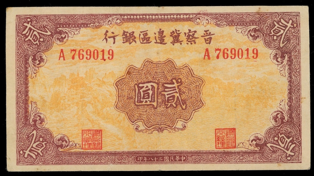 1939年晉察冀邊區銀行2元,編號A769019,GVF