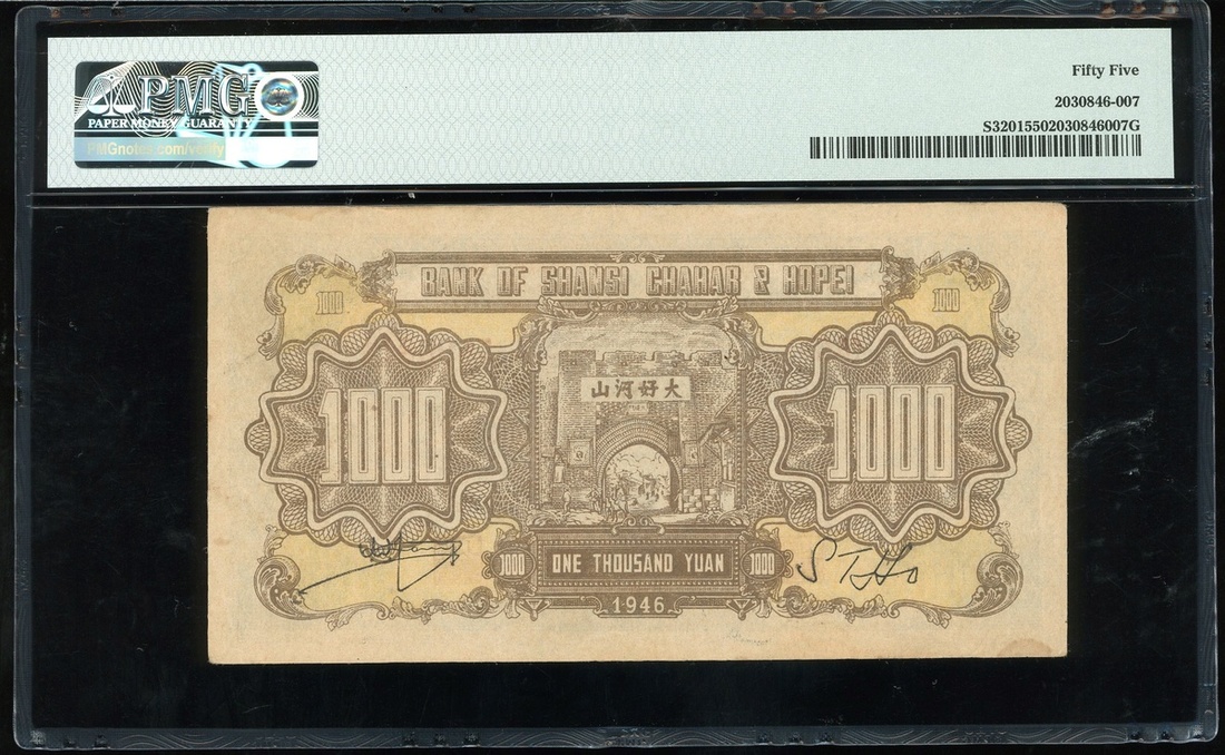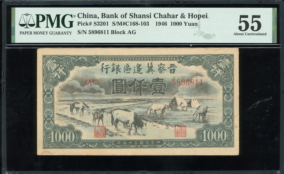 Bank of Shansi, Chahar and Hopei, 1000 Yuan, 1946, serial number AG 5896811, (Pick S3201), PMG 55 About Uncirculated.