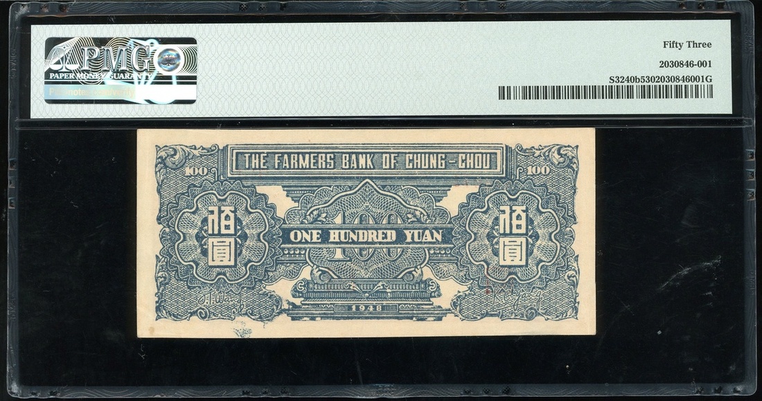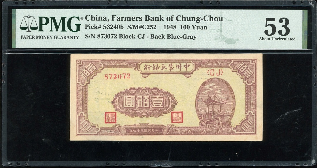 Farmers Bank of Chung-Chou, 100 Yuan, 1948, serial number CJ 873072, (Pick S3240b), PMG 53 About Uncirculated.