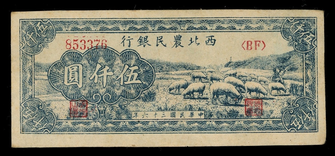 Sibei Nung Min Inxang, 5000 yuan, 1947, serial number 853376 BF, blue, sheeps at right, reverse pink, Temle of Heaven at centre,