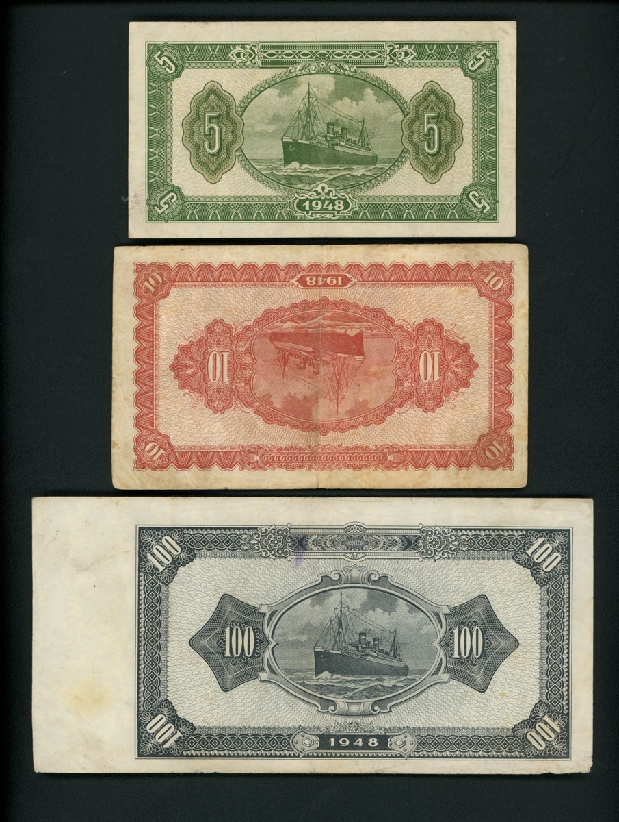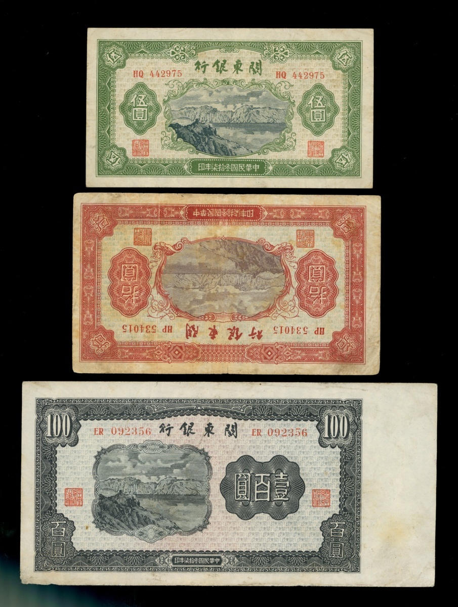 關東銀行1948年版一組4枚,包括5,10及100元,編號HQ442975,HP534015,BV145583及R092356, 50元評PMG 30,10元EF,其他UNC