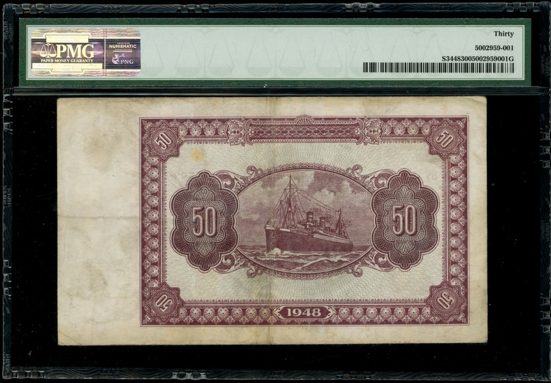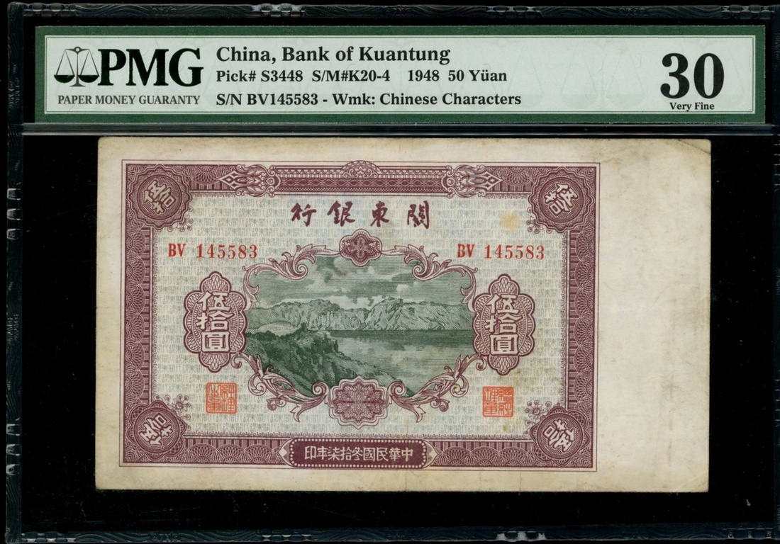 Bank of Kuantung, a group of 4x 1948 series, 5, 10 and 100 yuan, serial numbers HQ442975, HP534015, BV145583 and ER092356, (Pick S3446-3449), 50 yuan graded PMG 30, 10 yuan very fine, and the rest about uncirculated (4).