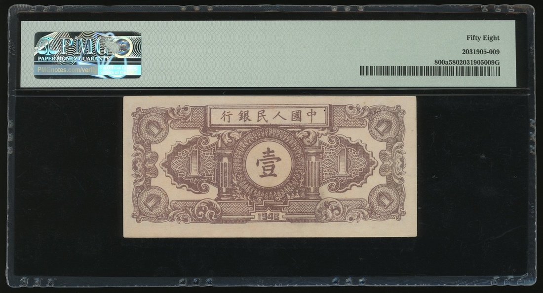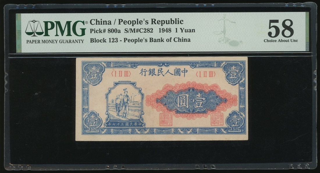 1948年中國人民銀行第一版人民幣1元「工農」,編號I II III,PMG 58
