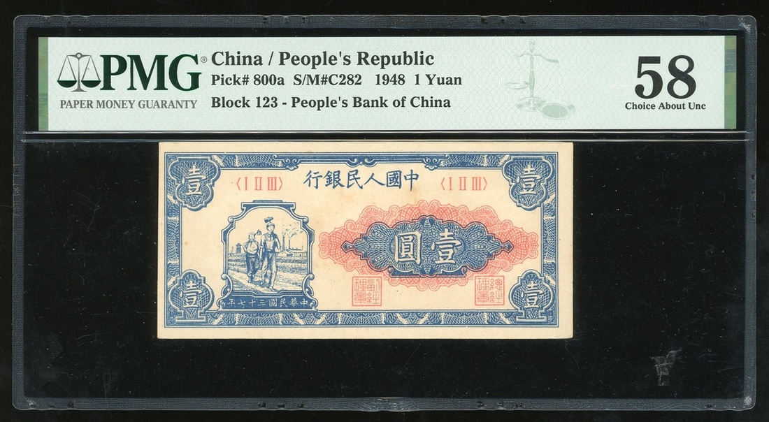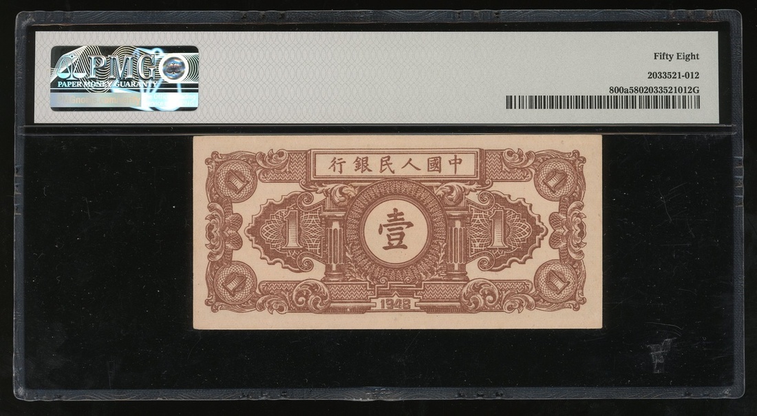 1948年中國人民銀行第一版人民幣1元「工農」,編號I II III,PMG 58