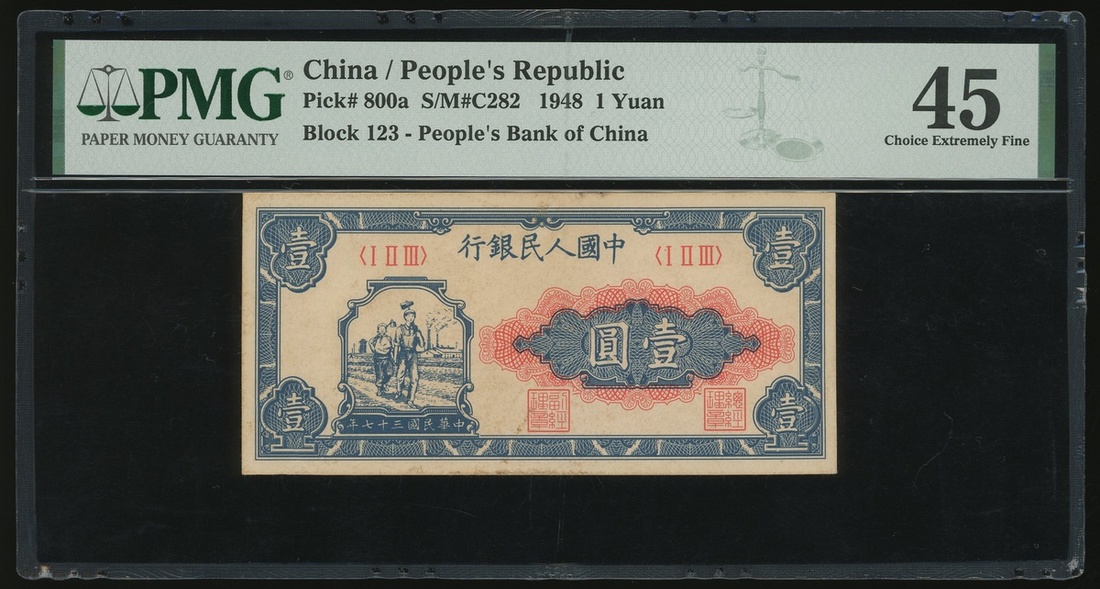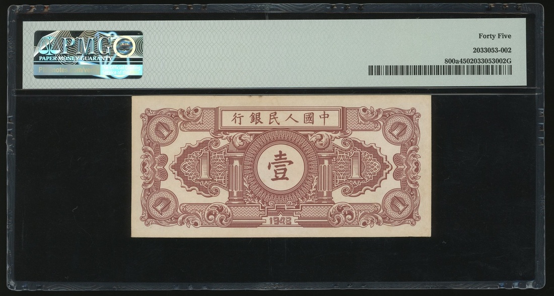 1948年中國人民銀行第一版人民幣1元「工農」,編號I II III,PMG 45