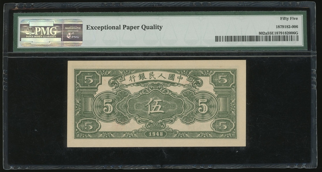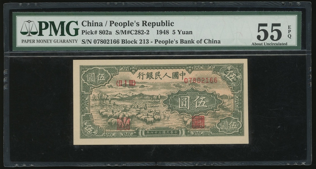 1948年中國人民銀行第一版人民幣5元「牧羊」,編號II I III 07802166,PMG 55EPQ