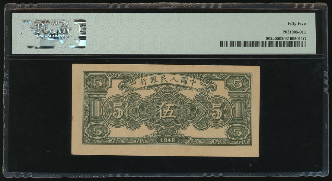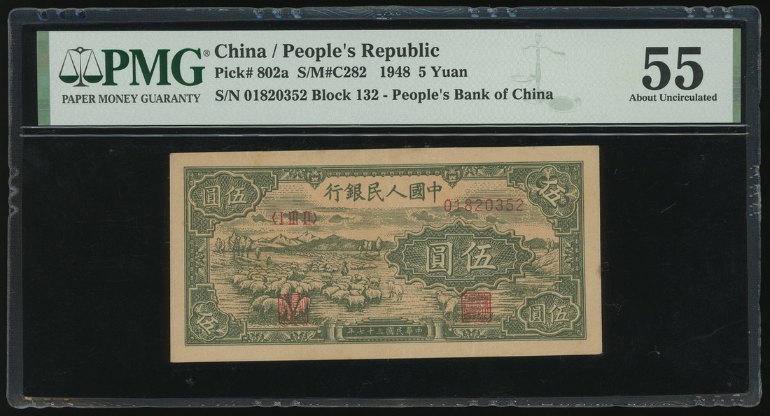1948年中國人民銀行第一版人民幣5元「牧羊」,編號I III II01820352,PMG 55