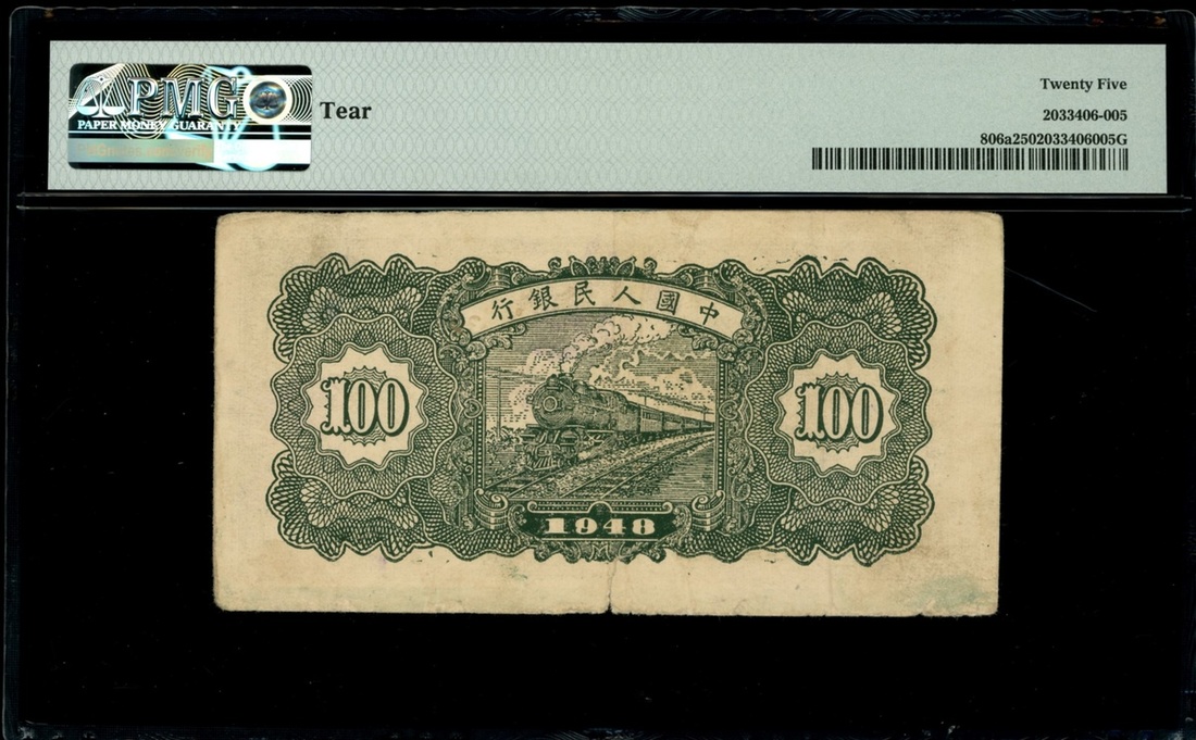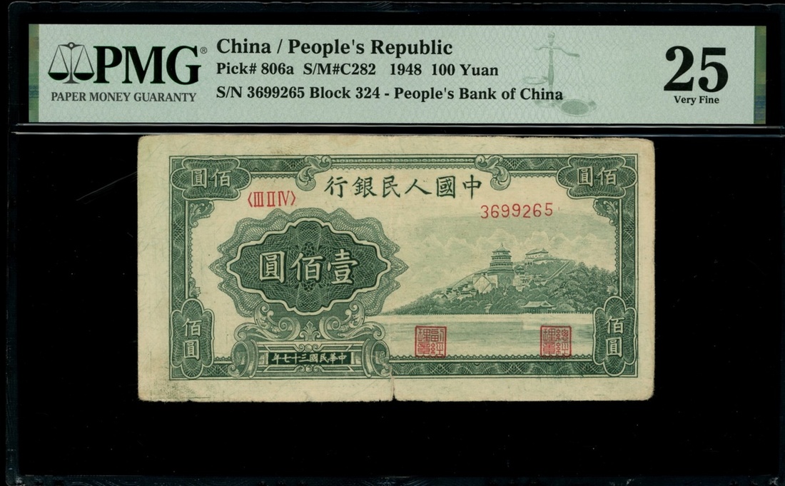 1948年中國人民銀行第一版人民幣100元「萬壽山」,編號III II IV 3699265,PMG 25,有裂