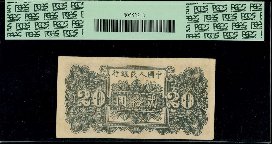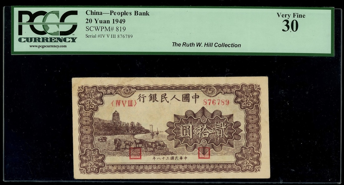 1949年中國人民銀行第一版人民幣20元「棕六和塔」,編號IV V III 876789,PCGS Currency 30,前Ruth W. Hill 藏品