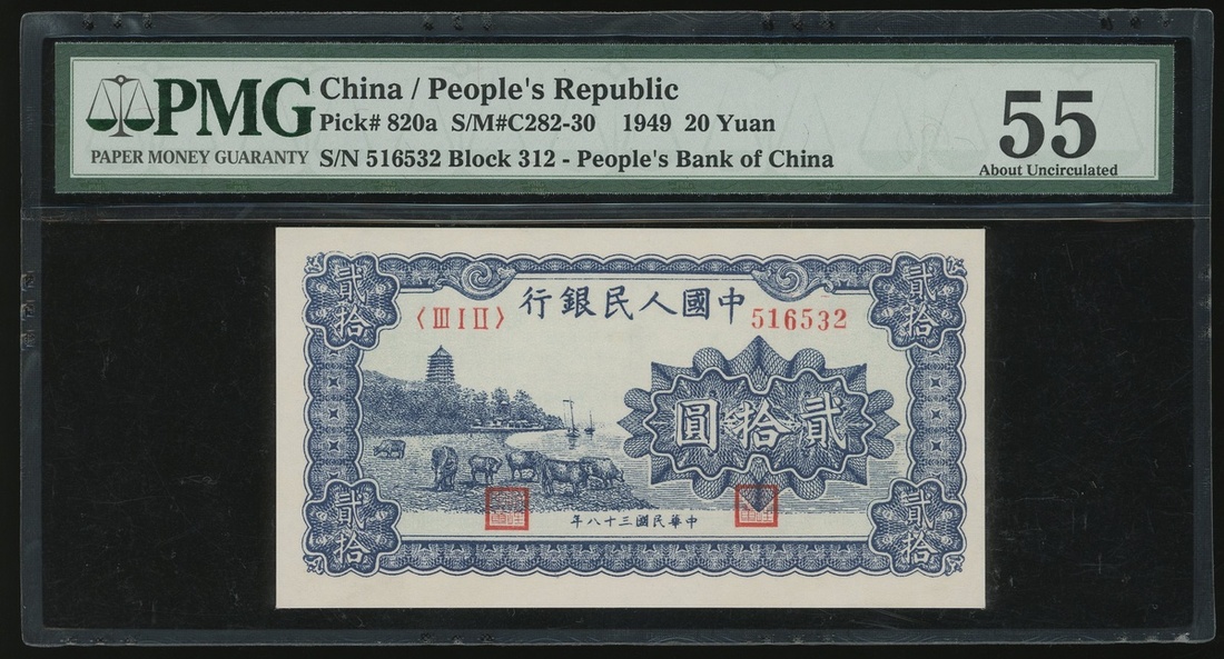 1949年中國人民銀行第一版人民幣20元「藍六和塔」,編號III I II 516532,PMG 55