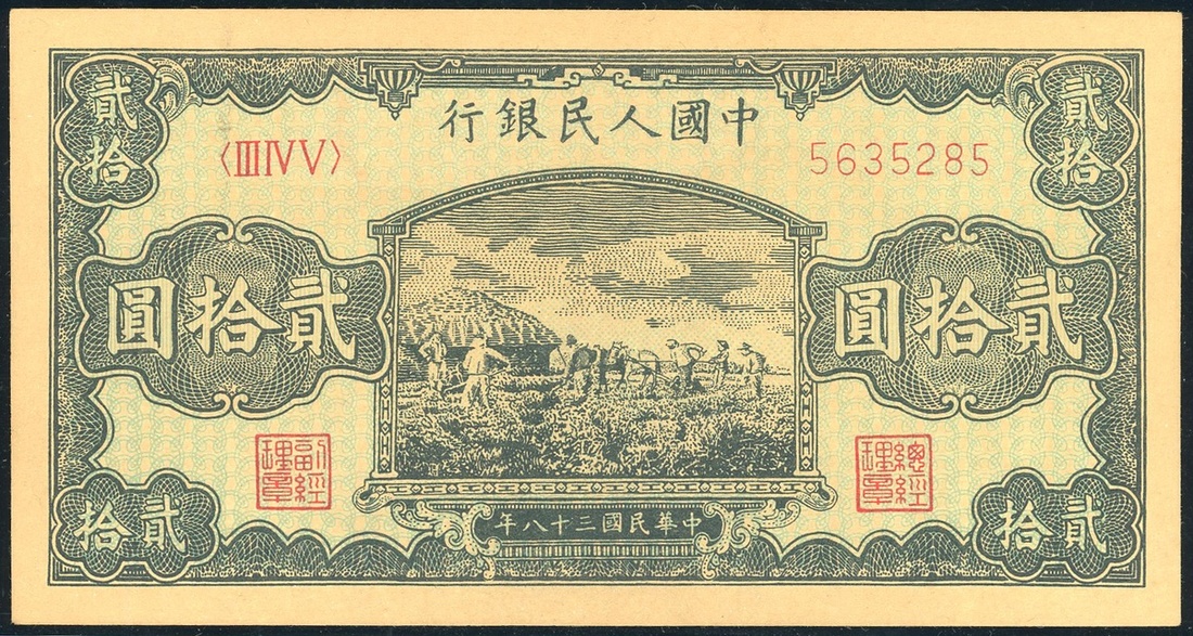 1949年中國人民銀行第一版人民幣20元「打場」老假票,編號III IV V 5635285,AU,售後不設退換