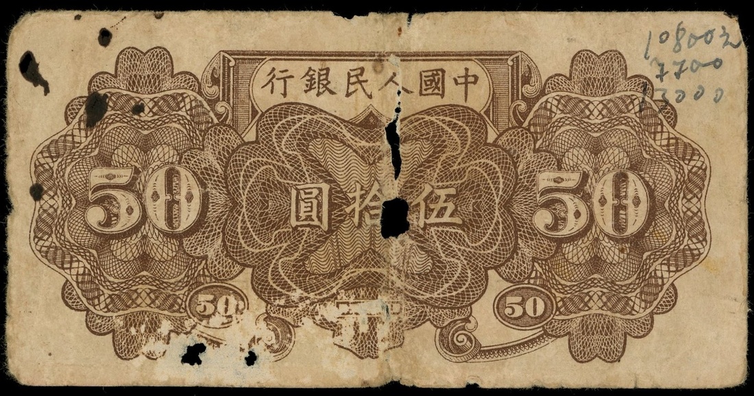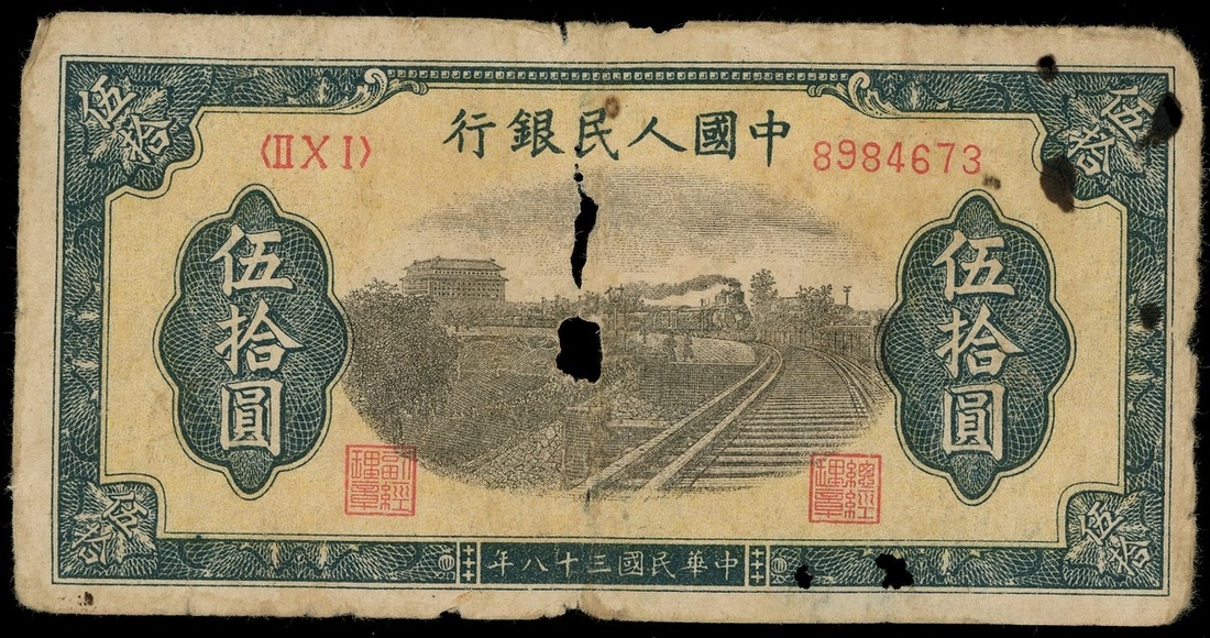 People's Bank of China, 1st series renminbi, 1949, 50 yuan, 'Train', II X I 8984673 and 200 yuan, 'Steel Smelting' III V IV 67123194,