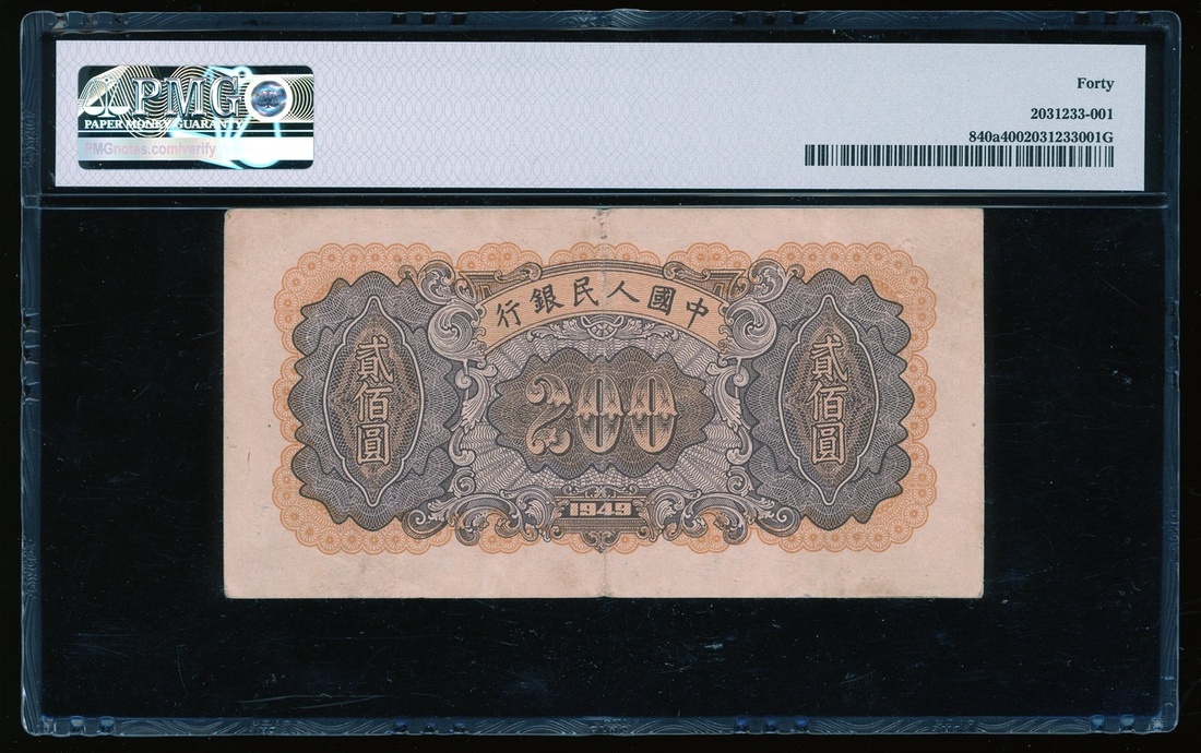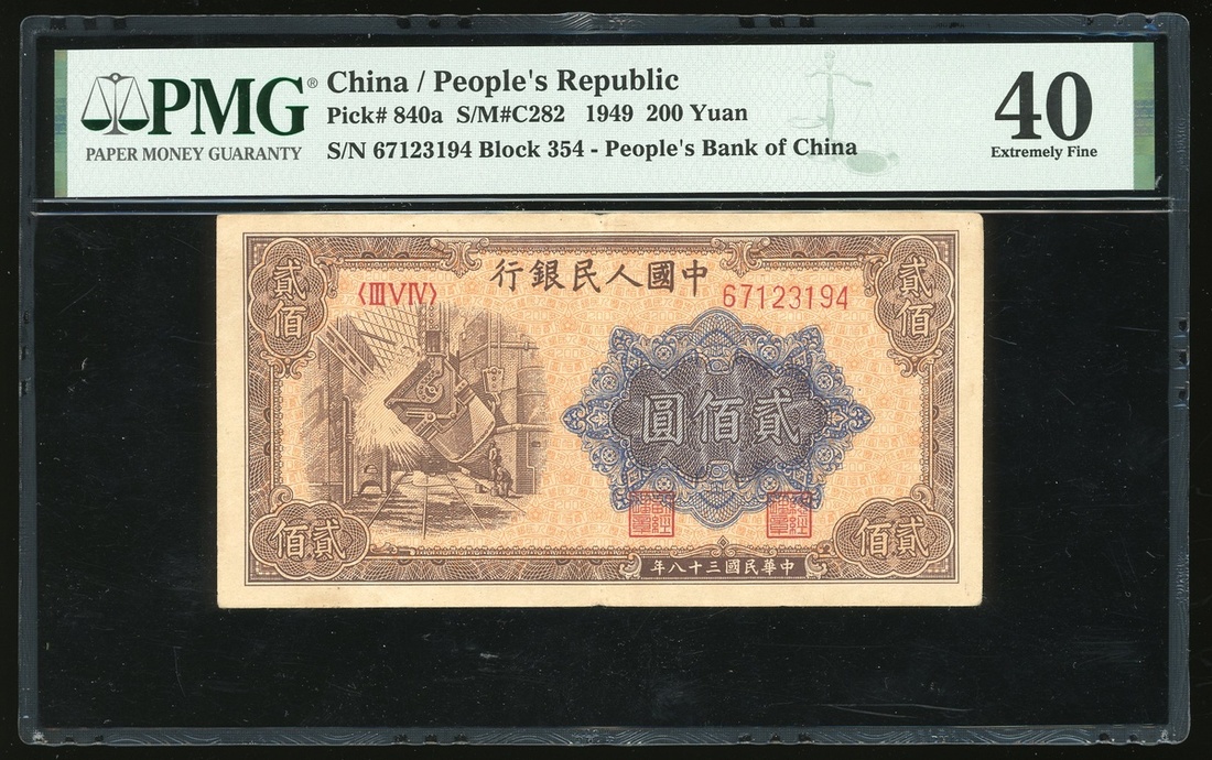 1949年中國人民銀行第一版人民幣50元「火車」,編號II X I 8984673,及200元「鍊鋼」,編號III V IV 67123194,前者G品相有孔,後者PMG 40