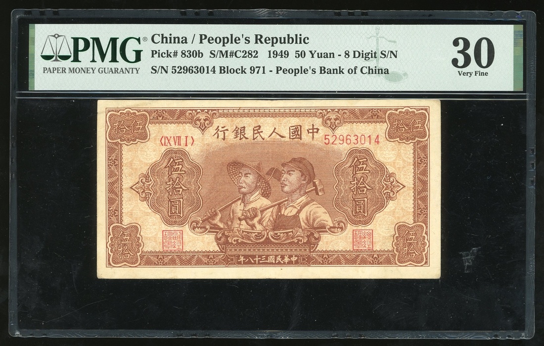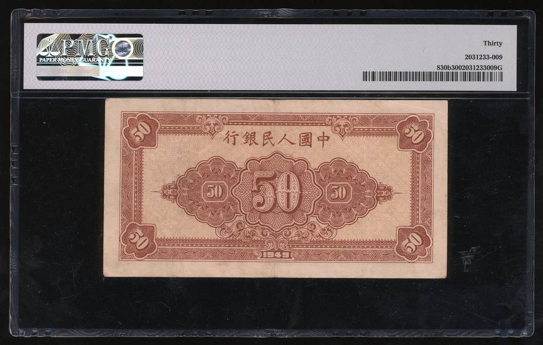 1949年中國人民銀行第一版人民幣50元「工農」,編號IX VII I 52963014,PMG 30